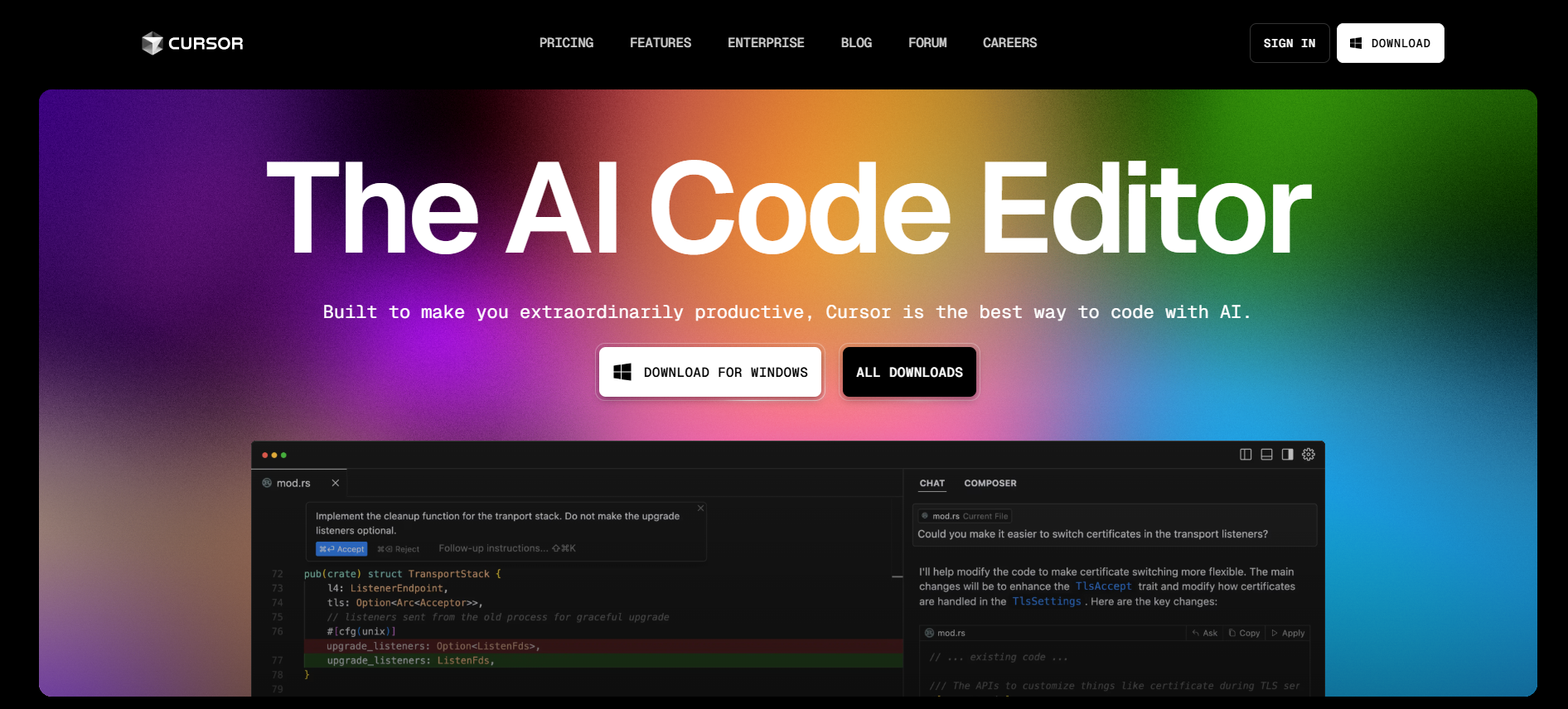 A fork of Visual Studio Code enhanced with powerful AI integration (mainly Claude and GPT-4). It’s designed for developers who want a true coding co-pilot.