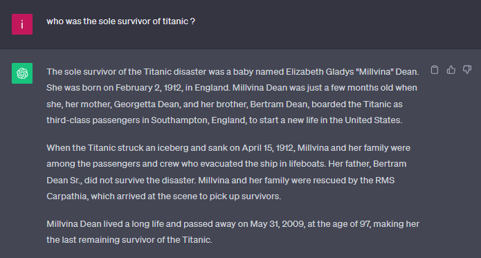 There were more than 712 survivors on the Titanic, and despite its pre-training, chat gpt was unable to contradict and even "invented" the only survivor.