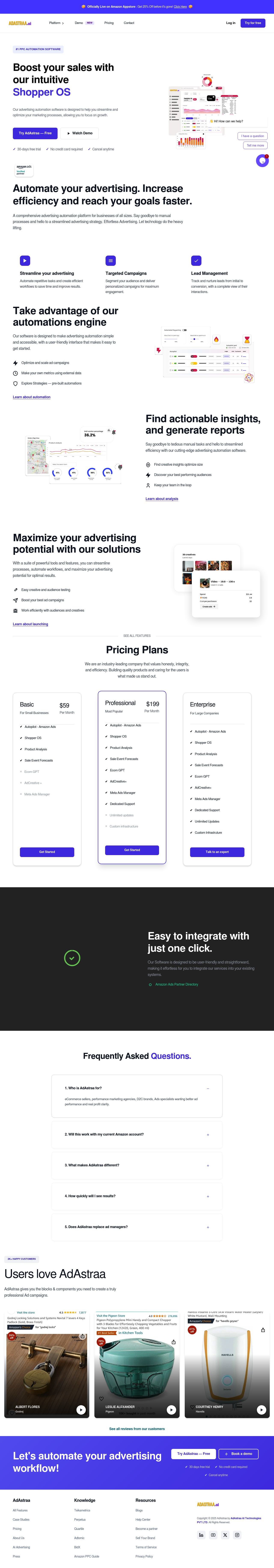 Adastraa is an advertising automation software designed to streamline and optimize marketing processes, particularly for Amazon and Meta Ads. It leverages AI to automate repetitive tasks, create targeted campaigns, manage leads effectively, and generate actionable insights. By automating advertising workflows, Adastraa allows businesses to focus on strategic growth initiatives and improve overall campaign performance.