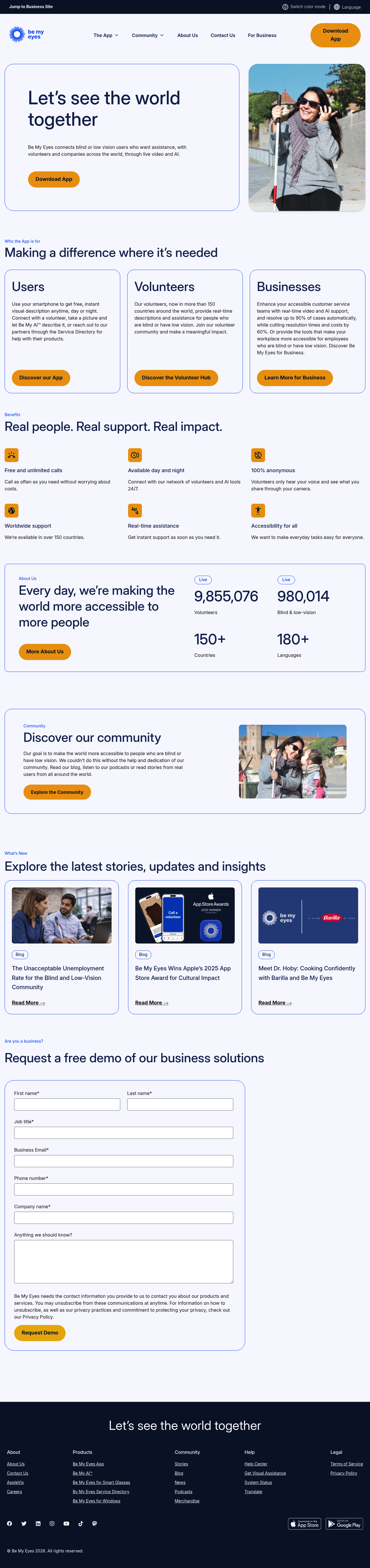 Bemyeyes connects blind and low-vision individuals with sighted volunteers for visual assistance through live video calls.