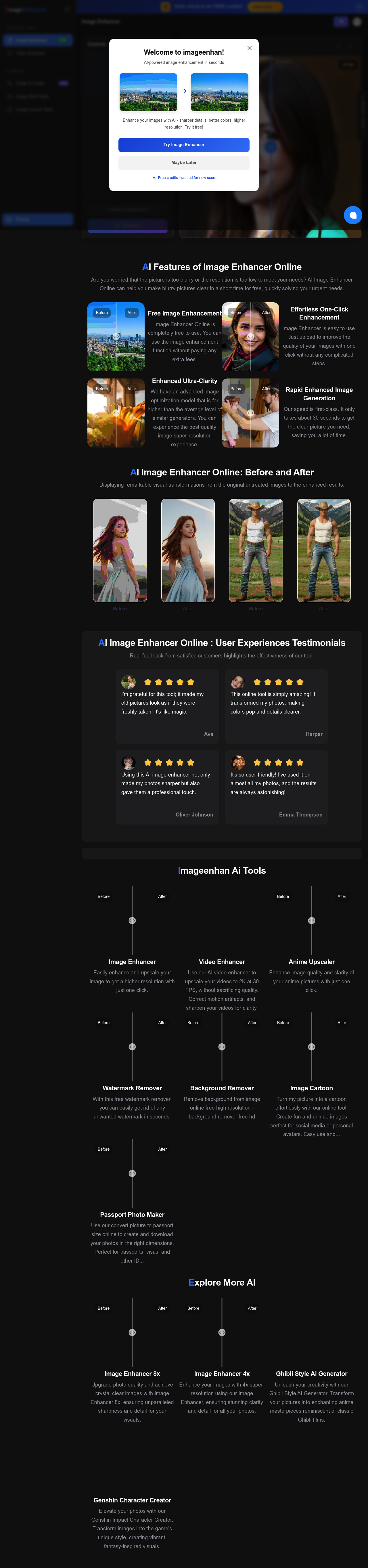 Imageenhan is an AI-powered online image enhancer that quickly and easily improves photo quality. It employs advanced AI algorithms to remove blur, increase resolution, and enhance details, transforming low-quality images into clear, high-resolution visuals. The tool offers various enhancement modes to cater to different image types.