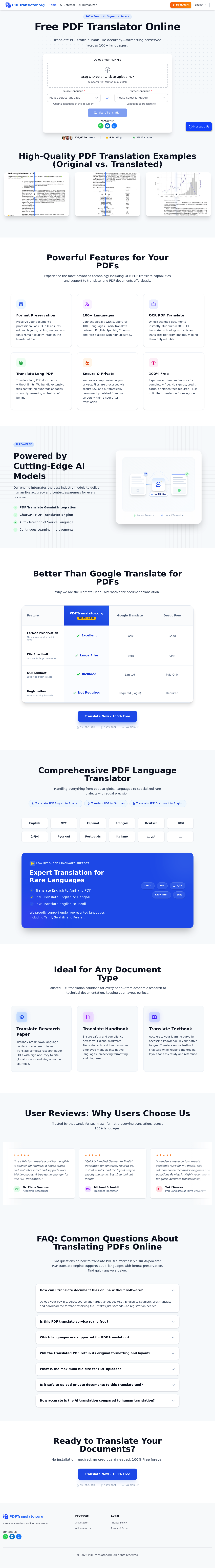 Translate PDFs online for free with PDFTranslator.org! AI-powered translation preserves formatting across 100+ languages with human-like accuracy.