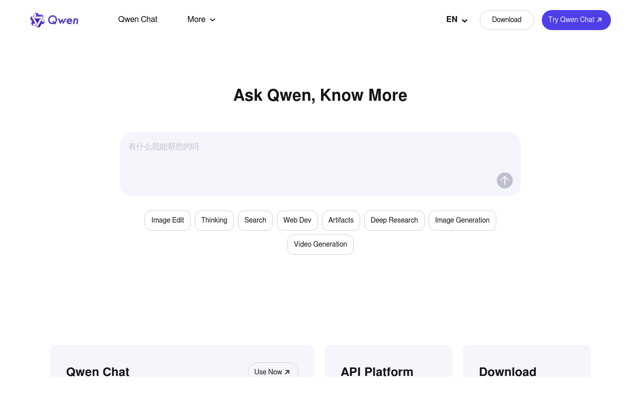 Qwen Chat is an AI assistant designed to help users with tasks such as image generation, research, web development, and answering general knowledge questions. It uses advanced AI models to provide accurate results, streamlining workflows and boosting productivity. The platform offers both a chat interface and an API.
