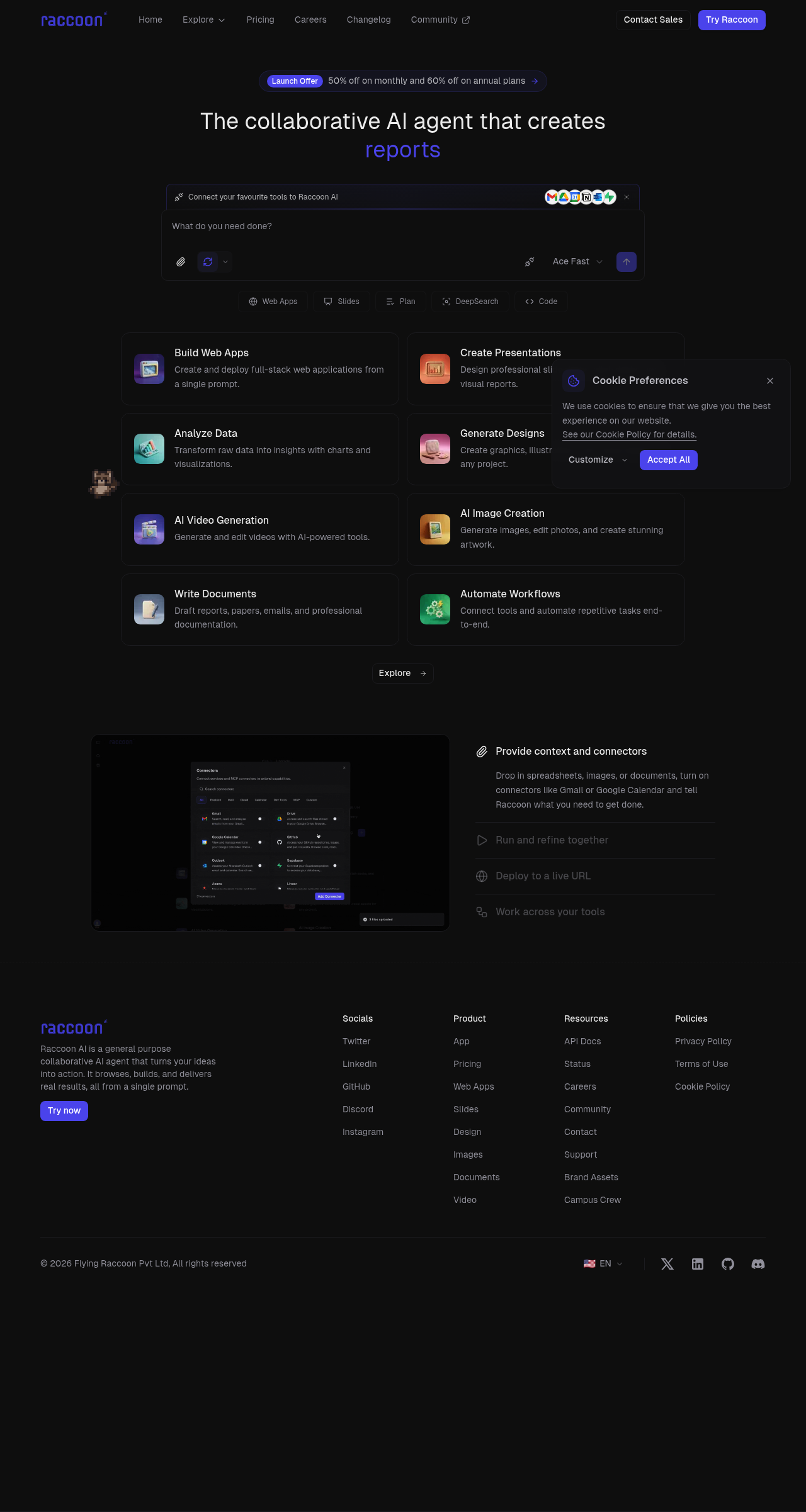 Raccoon AI: The collaborative AI agent to build web apps, presentations, reports, and more from a single prompt. Boost your productivity!