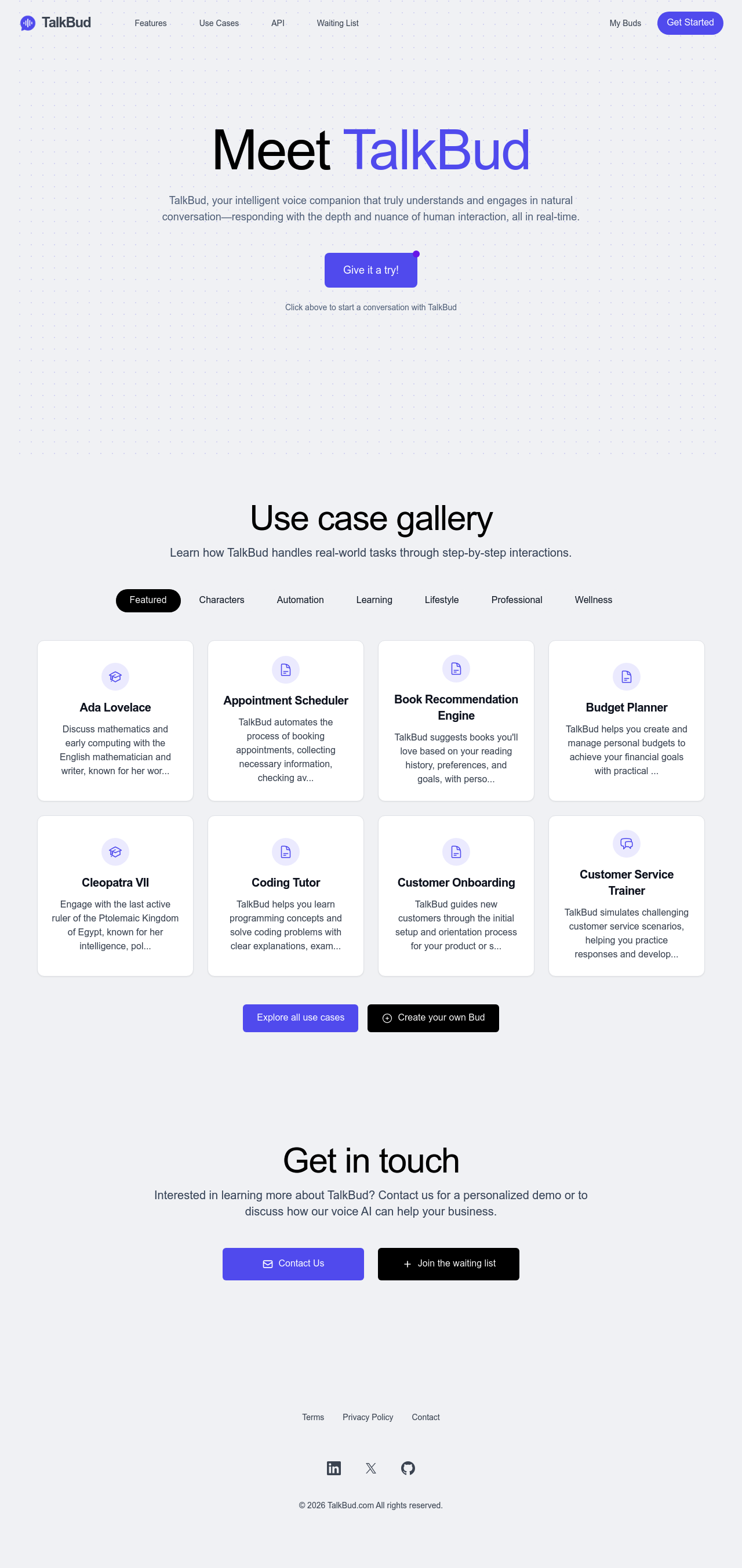 TalkBud: Engage in natural, real-time voice conversations with an intelligent AI companion that understands and responds with human-like nuance.